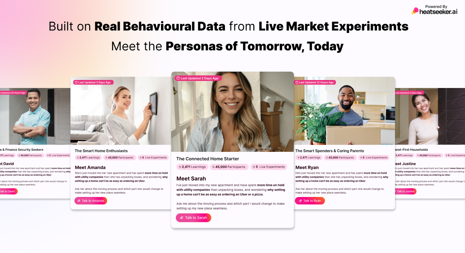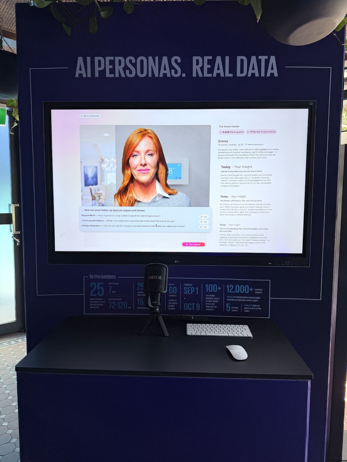 In just 120 hours, Heatseeker ran 25 experiments, reaching 250,000 people and capturing millions of behavioral signals. Hundreds of attendees interacted with the synthetic personas to ask about property ownership, smart devices, and everyday tech use—one of the first live datasets showing how real audiences engage with AI trained purely on behavioral evidence.